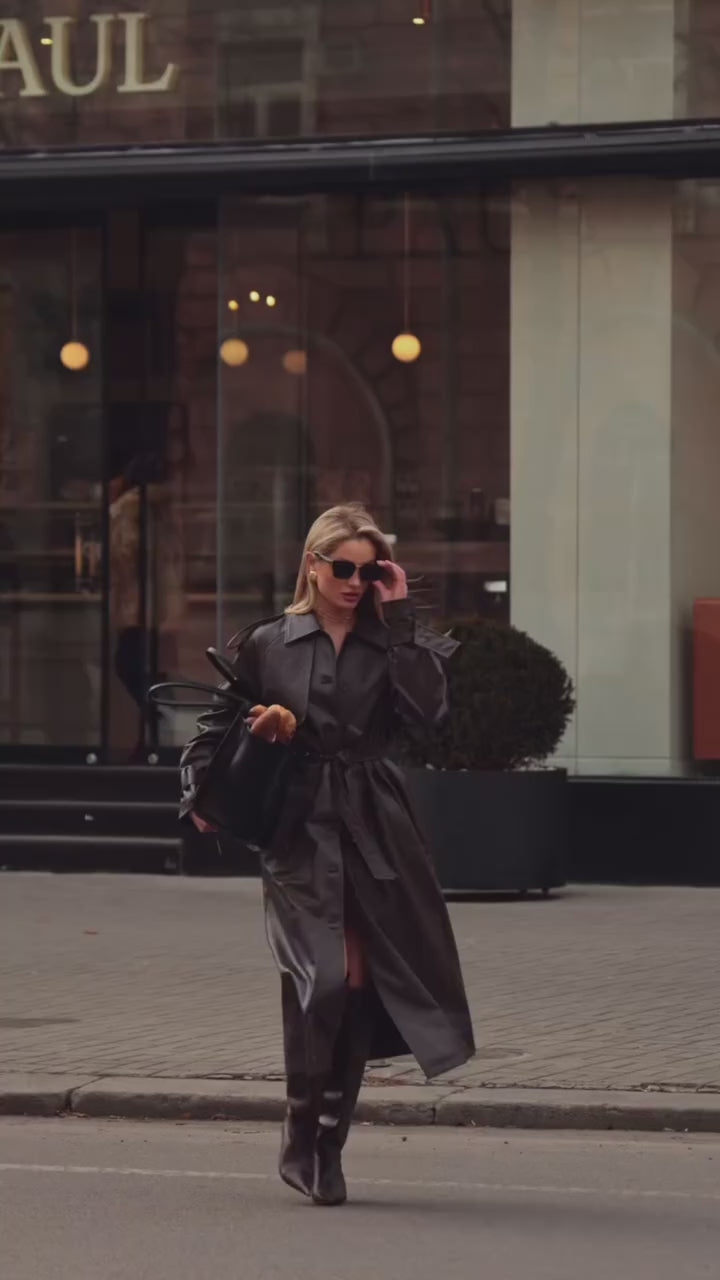 Luxurious Brown Faux Leather Trench Coat | Long, Belted & Oversized Fit.